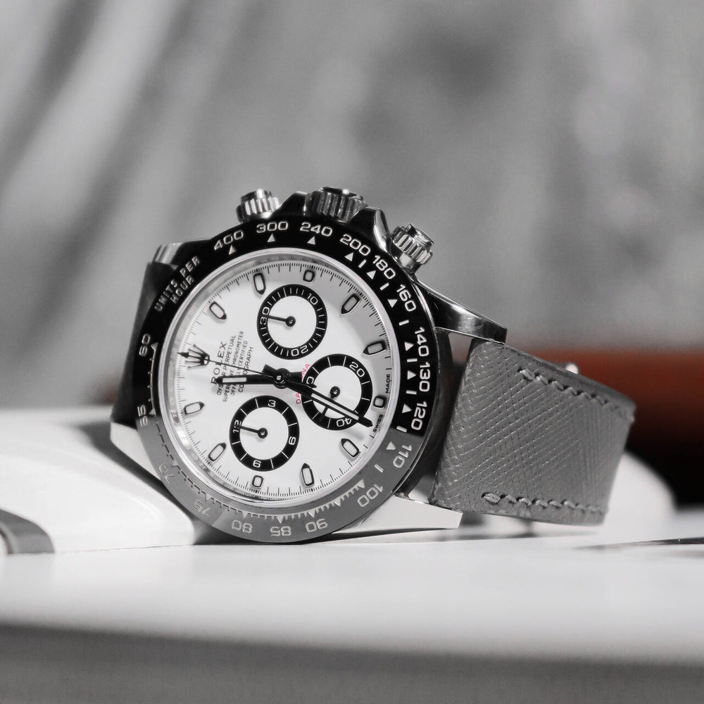Style: The Grey Saffiano Strap is designed for watch enthusiasts who appreciate refined simplicity. Crafted from premium Saffiano leather, this strap brings a distinctive texture that instantly elevates any timepiece. The clean-cut design offers a sleek, modern look without unnecessary details. It’s a perfect match for watches like the Rolex Daytona, adding subtle sophistication without overpowering the watch’s bold character.