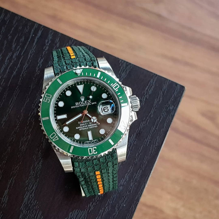 **All of our straps are Handcrafted by our experienced artists and are all bespoke, therefore Crafting a Extreme Green Chessboard with Orange Stripe strap for your Rolex watch and personalized sizing is our specialty. We have been making straps for big watch brands like Rolex, Patek Philippe, Hublot, Breitling, Audemars Piguet (AP), Tudor, Omega, Seiko, Panerai, and almost any other watch that you own for over 15 years of craftsmanship experience. Discuss with us now the straps you and your watch deserve!