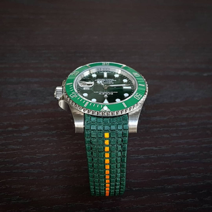 Style: Enhance your watch’s sportier look with the Chessboard Series. The surface features a deeply 3D texture, creating square gaps that resemble a chessboard. We apply detailed hand painting in green to cover every deep corner of the surface’s gaps. Additionally, we finish it off with an orange stripe for a cooler look. This Extreme Green Chessboard with Orange Stripe strap enhances your Rolex, making it appear more sporty and stylish.