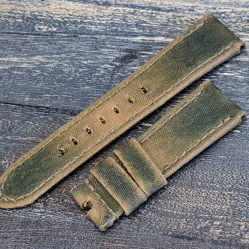 Style: green canvas with beige discoloration on some areas as the surface, with leather as the backside, creating a mysterious-looking patina that will light up the artistic spirit in you and your watch. Definitely a perfect choice for watch and art lovers.
